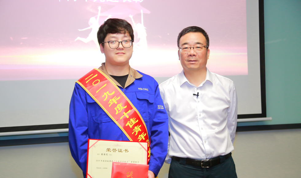 董事长亲切的与每一位获奖者交谈,对他们坚守岗位,不懈奋斗的精神给予肯定,并亲手为他们佩戴绶带,颁发证书、红包。董事长特别强调集团将唯一的“十佳青年标兵”荣誉颁发给了诺邦员工张国炎,肯定他扎根基层,勤于钻研,勇于创新,忠于公司,是全集团青年人学习的楷模,同时鼓励获奖员工持续发扬青年人的韧劲与奋斗精神,以饱满的热情和昂扬的斗志,谱写更加壮丽的青春之歌!