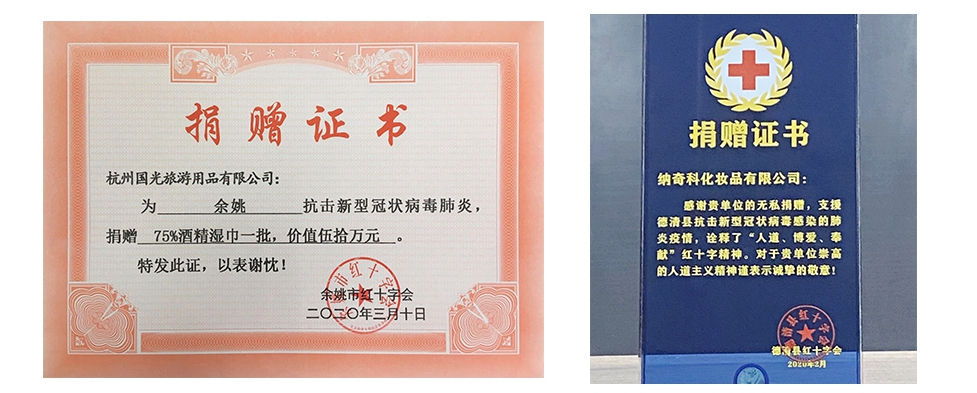 除了此次捐赠外,国光及纳奇科也向中国造纸协会生活用纸专业委员会、径山商会、德清红十字会等捐款捐物累计达到近80万元,为战胜新冠肺炎疫情尽一份绵薄之力。