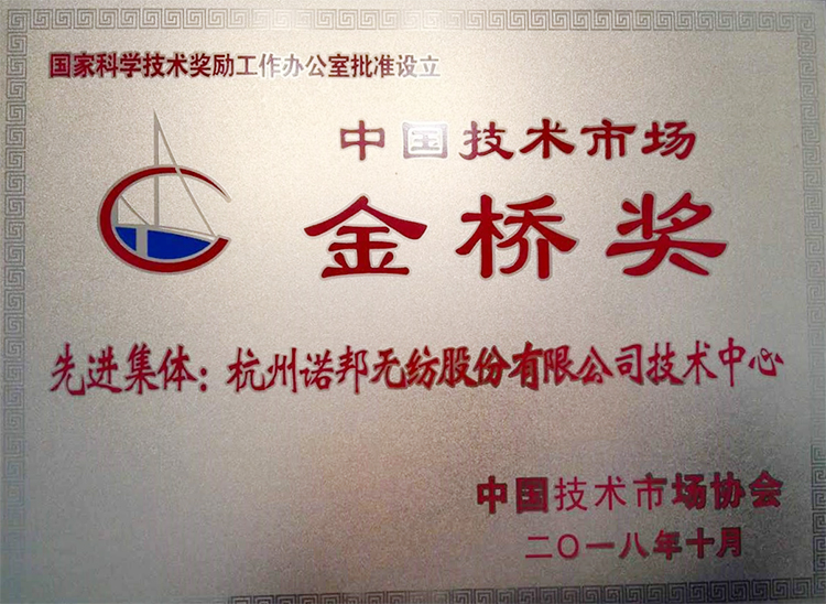 本届金桥奖由各省、自治区、直辖市、计划单列市等和国务院有关部门及直属机构的科技主管部门,各有关协会组织推荐,经中国技术市场协会金桥奖评审委员会专家认真评审,最终评出突出贡献奖24个,优秀项目172项、先进集体116个、先进个人216人,优秀组织奖13个。在此次评选中,杭州诺邦无纺股份有限公司技术中心荣获--中国技术市场金桥集体奖。