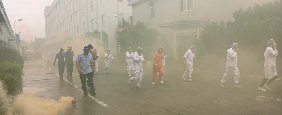 演习在一阵刺耳的警报声中拉开了序幕,员工在听到了警报声后随即意识到这是火情警报,现场浓烟滚滚,所有员工结合平时消防培训所讲的逃生法则,立即用湿毛巾或衣物捂住口鼻,迅速逃离现场,在工作人员疏导下,抵达指定安全地点集合。清点人数时发现有一人被困火场,立即启动应急救援方案快速响应,救援小组迅速对被困人员展开救援。