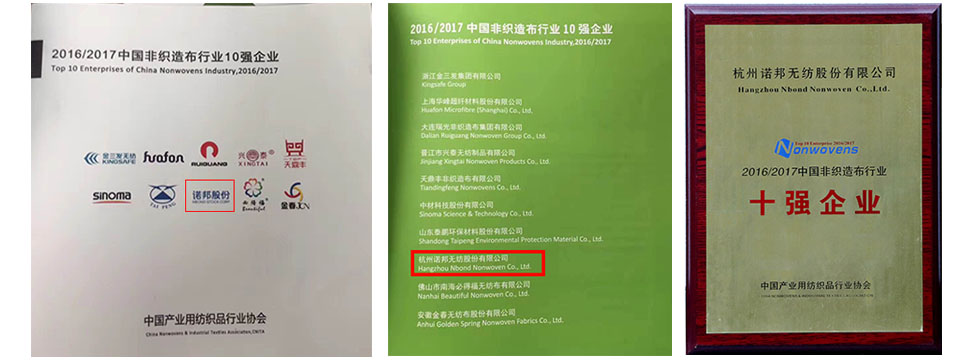 此外,会议审议并通过了协会人事、财务等相关事宜,对4家研发基地授牌,并表彰了企业信用评价AA级以上信用企业、中国非织造布行业十强企业、优秀供应商等多项行业先进。诺邦股份喜获2016/2017中国非织造布行业十强企业,这是诺邦继连续2012-2013、2014-2015年获得十强后,第三次获得中国非织造布行业十强企业称号。