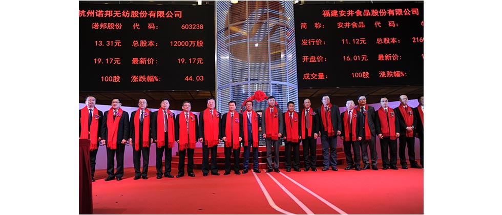 2月22日上午,杭州诺邦无纺股份有限公司(股票简称:诺邦股份,股票代码:603238)正式在上海证券交易所主板上市,成为老板集团旗下控股的第二家A股上市公司,诺邦股份董事长任建华与区委书记戴建平共同敲响上市铜锣!诺邦至此成为余杭区第14家上市企业,也为余杭区2017年第三家在上交所主板挂牌的上市企业。
