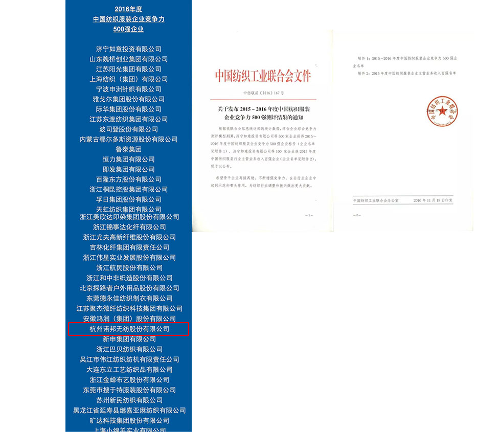 2016年12月12日,中国纺织工业联合会根据信息统计部统计数据,结合企业综合竞争力测评模型测算,公布了2015~2016年度中国纺织服装企业竞争力500强企业及2015年度中国纺织服装行业主营业务收入百强企业名单。热烈祝贺诺邦股份荣获“2015~2016年度中国纺织服装企业竞争力500强企业”荣誉称号!
