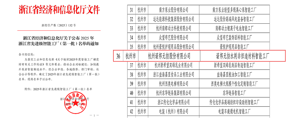 近日,浙江省经济和信息化厅正式公布2025年浙江省先进级智能工厂名单。经企业申报、各地推荐、部门审核、社会公示等程序,诺邦无纺喜获“浙江省先进级智能工厂”荣誉称号。
